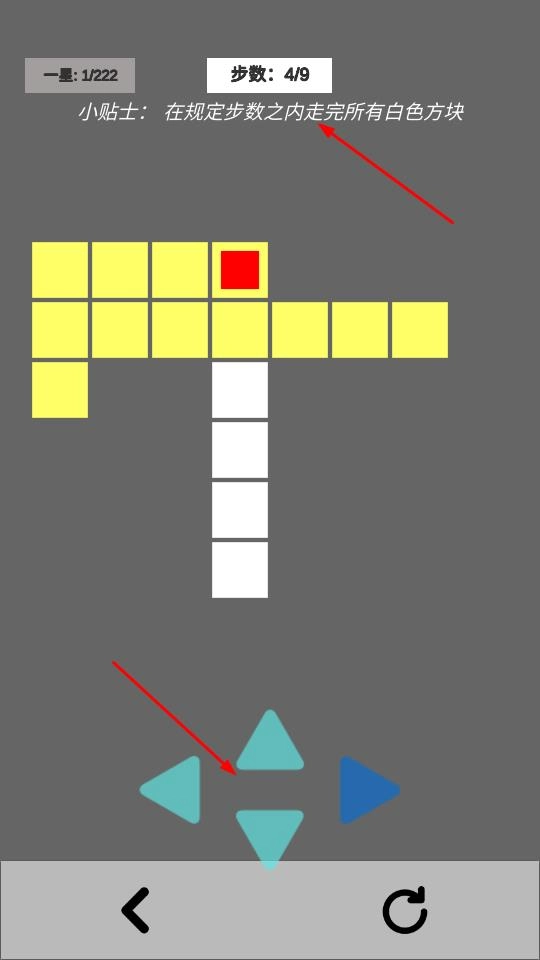 2、需要利用方向按钮操控角色,在规定步数内走完白色方块,避开障碍,稳步推进通关进程。