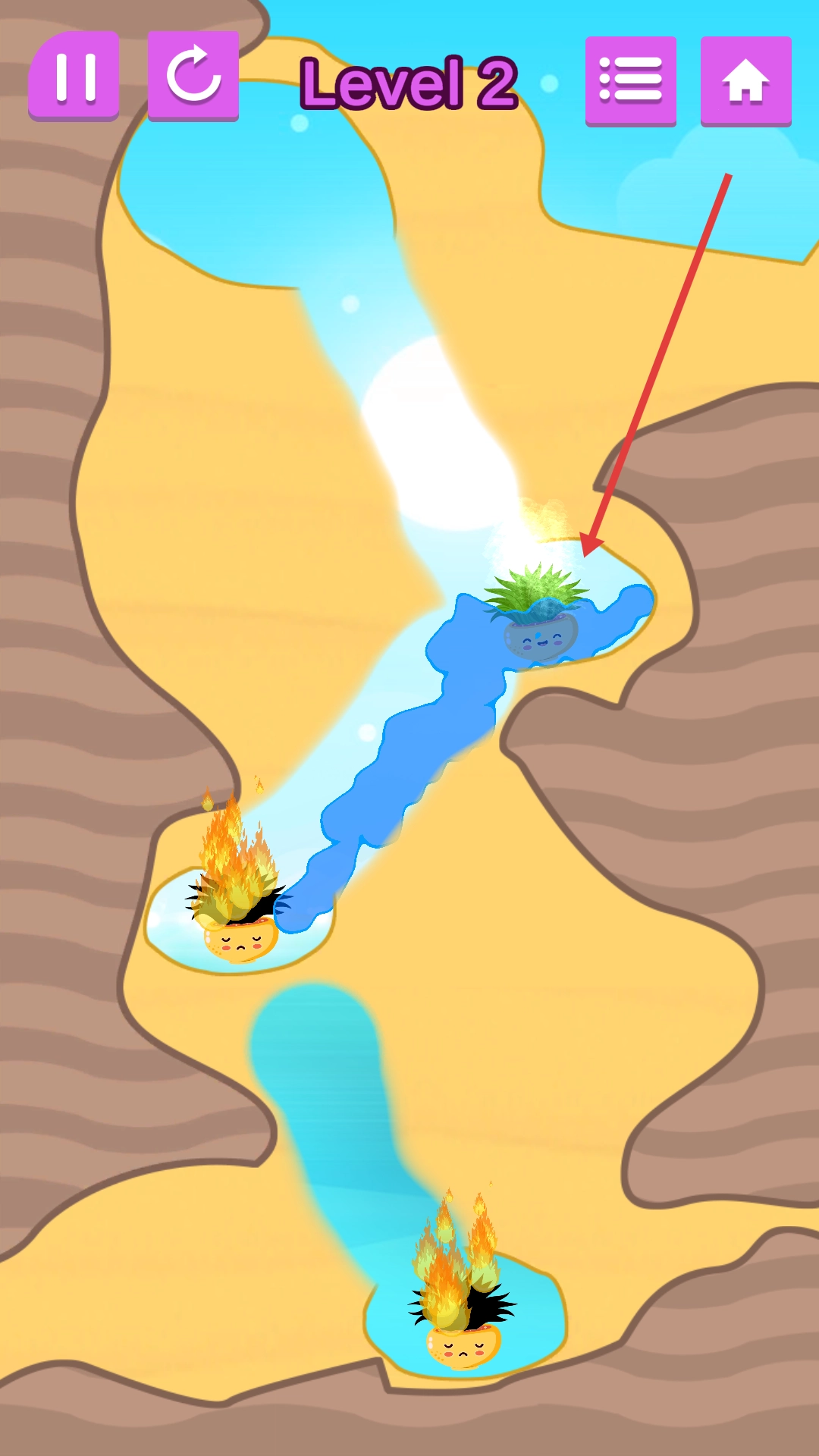 1、在沙漠环境中,引导上方的水源流向中间起火的植物,通过浇水扑灭火焰,让植物重新焕发生机。