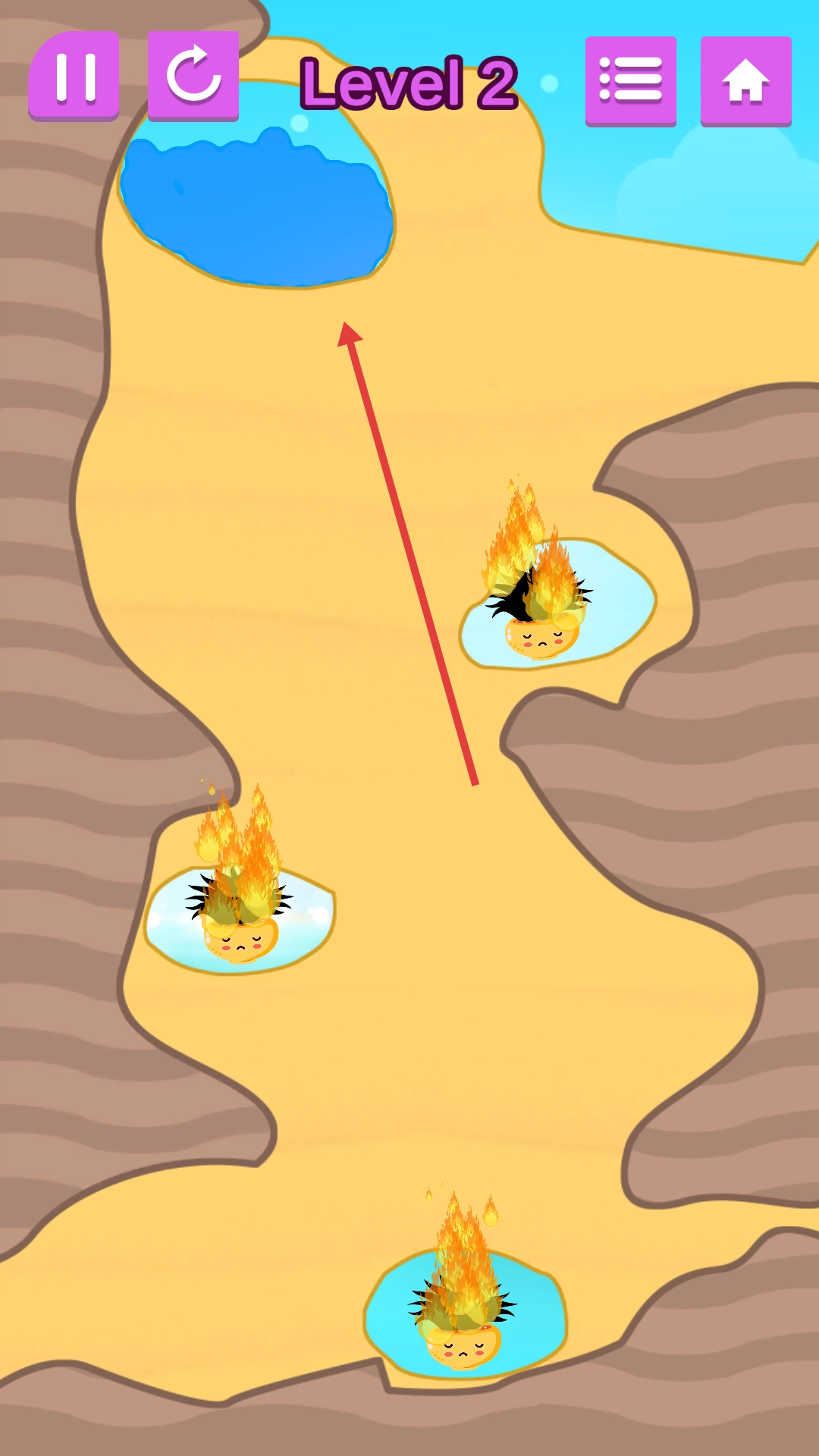 2、引水灭火的策略性:要依据地形特征规划引水路线,像借助斜坡引导水流、敲碎石块打通水路等,每一步操作都得经过策略考量,使休闲闯关既保留休闲感,又具备轻度烧脑的属性。