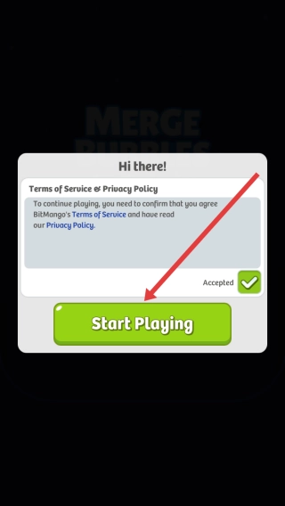 1、进入MERGE-BUBBLES游戏初始界面后,先勾选同意条款,再点击绿色的Start-Playing按钮,即可进入游戏。