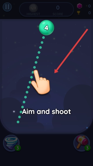2、游戏过程中请根据提示进行Aim-and-shoot操作,用手指对准方向发射带有数字4的绿色泡泡,开启合并步骤。