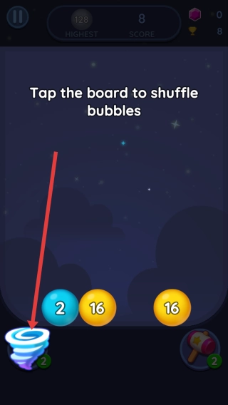 3、当出现Tap-the-board-to-shuffle-bubbles提示时,点击左下角的漩涡状道具,重新排列泡泡。