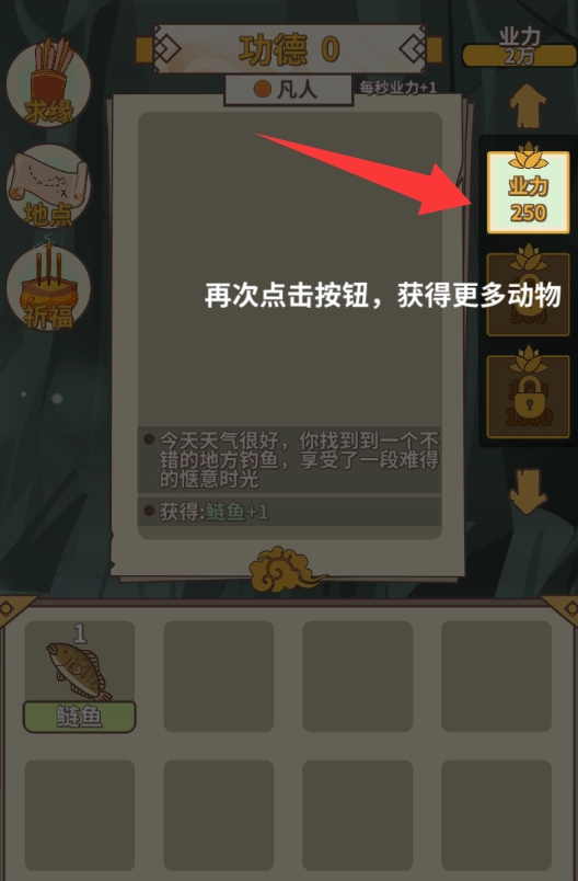 3、点击红色箭头的业力获取更多动物。