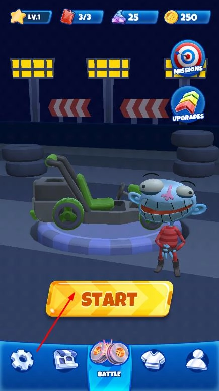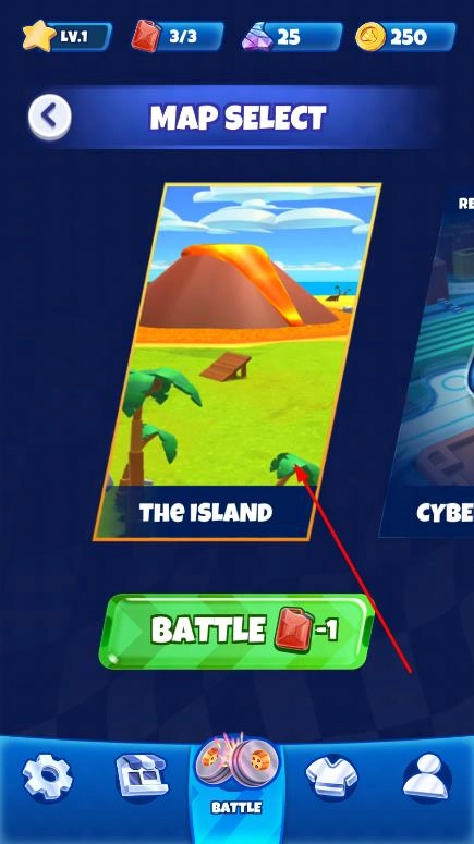 1、点击START按钮,进入地图选择界面,挑选THE ISLAND这类地图,此时会消耗1个道具,之后点击BATTLE即可开启比赛。