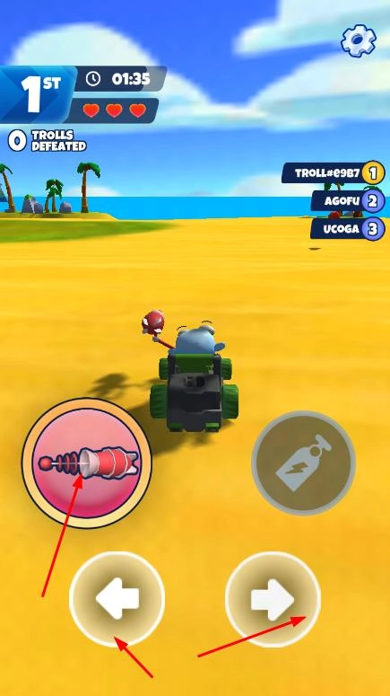 2、在卡丁车赛道上驾驶时,可借助左右箭头按钮操控方向,点击技能按钮即可释放道具来攻击对手。