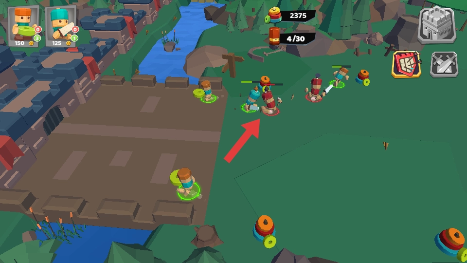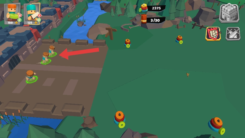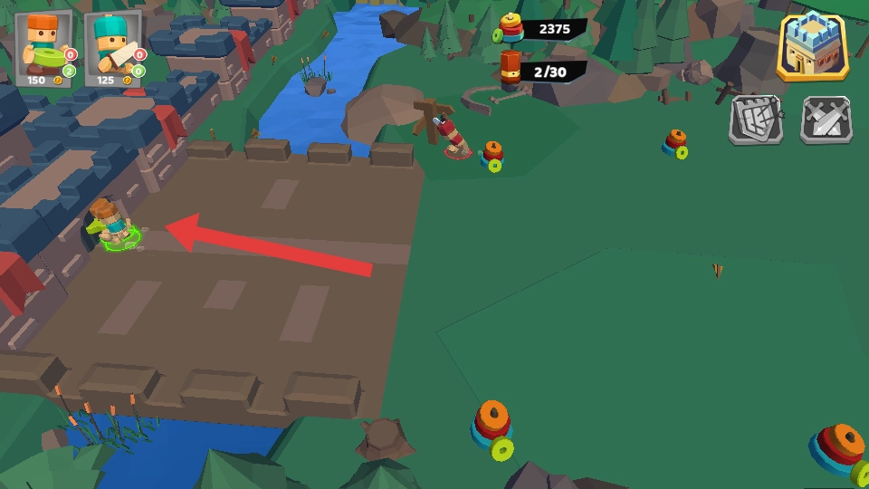 1、进入关卡,点击左上角的兵种农民的角色以及弓箭手,把他们拖放至桥梁、路径等关键的位置,构建防线。