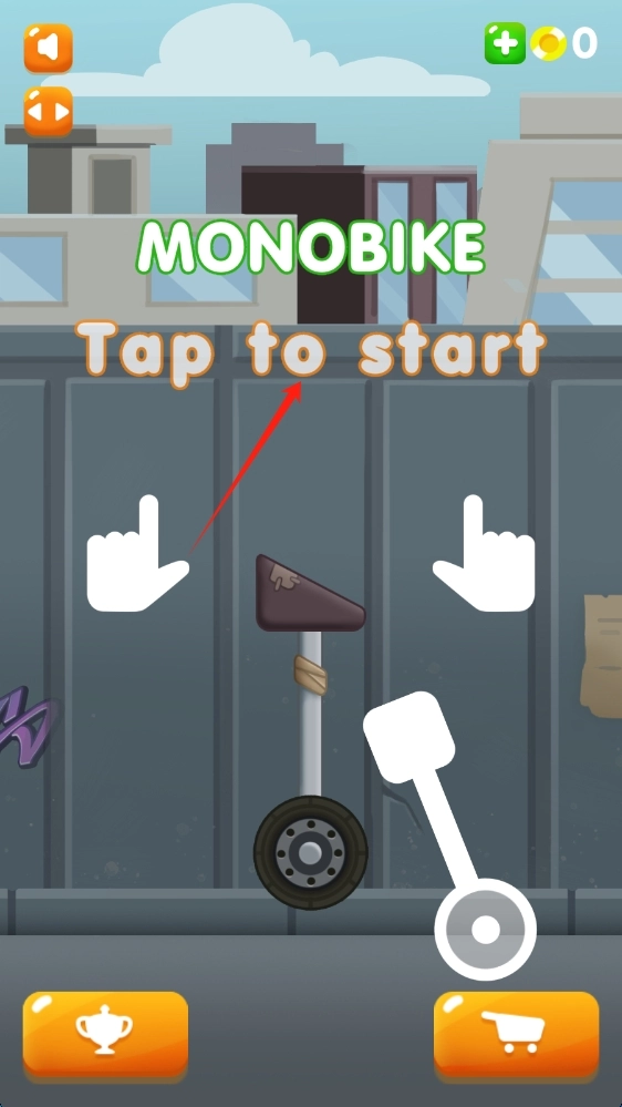1、进入MONOBIKE界面后,点击Tap-to-start选项启动独轮车平衡挑战,随后点击屏幕即可开始游戏。