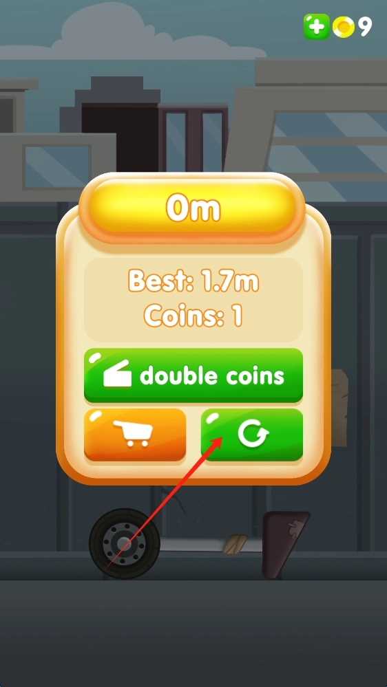 3、游戏结束后,在结算界面查看自己的最佳成绩与获得的金币数量,点击绿色按钮即可重新开启游戏,持续挑战自我,刷新最佳成绩记录。