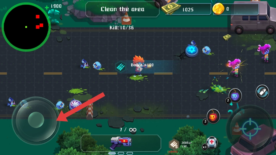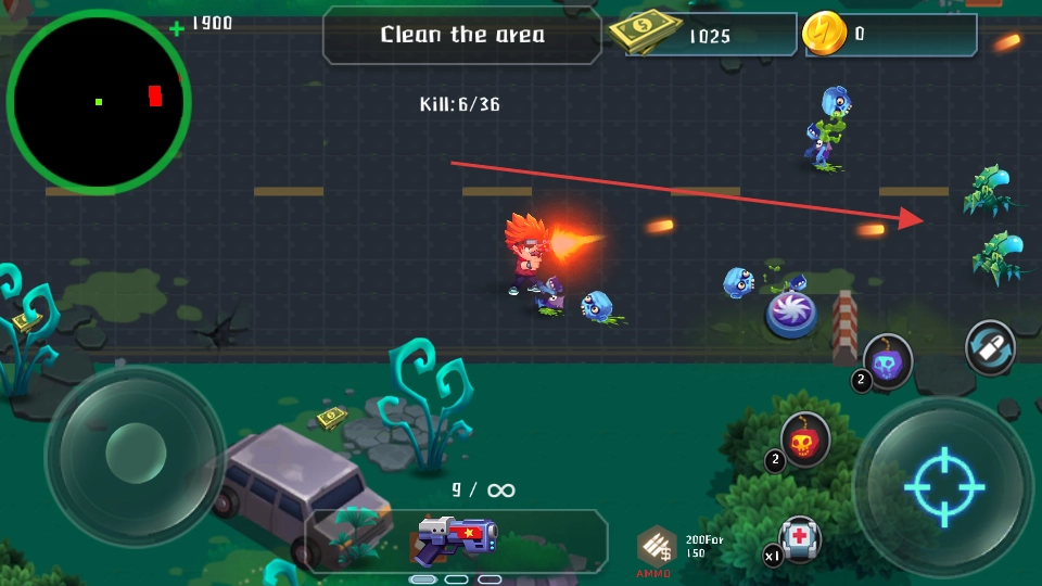 1、进入游戏,操作左侧摇杆控制红发主角移动,点击右侧射击键攻击僵尸,围绕Clean the area清理区域的任务。
