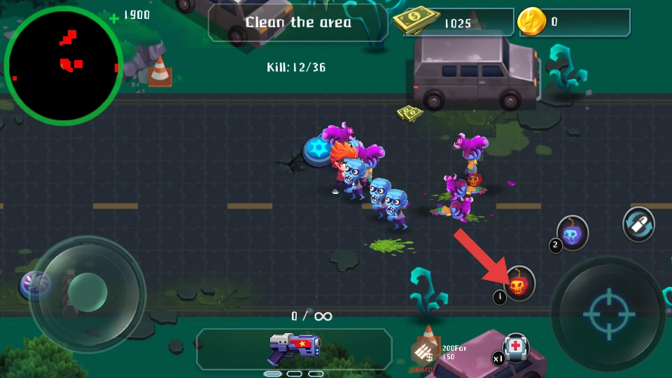 2、紧盯上方Kill:X/36击杀进度,遭遇僵尸群时,点右侧骷髅样式技能按钮释放技能清场,同时收集场景的金币。