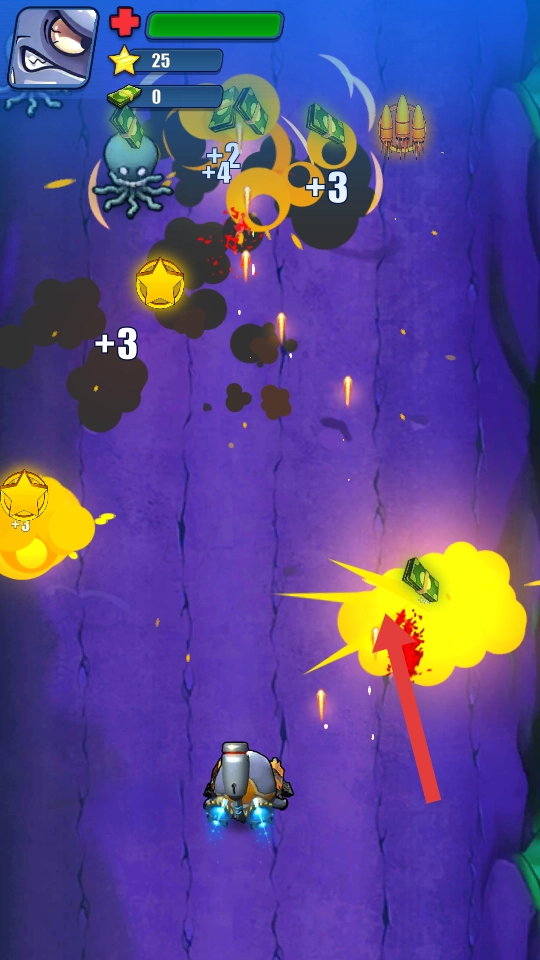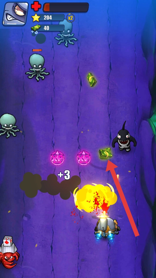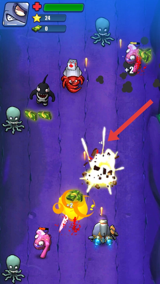 1、进入游戏,操控潜艇左右移动,瞄准上方海洋怪物章鱼、虎鲸射击,优先打靠近的敌人,别让其近身。
