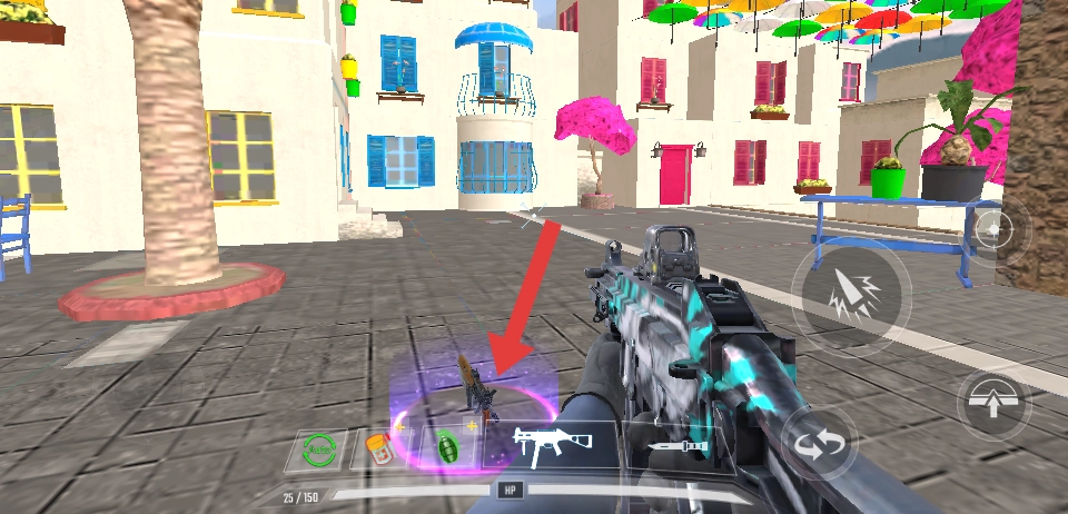 2、遇敌人时,点击火箭弹按钮锁定目标,准星对准发射,可快速清敌,同时注意场景中武器道具紫色光圈物品。