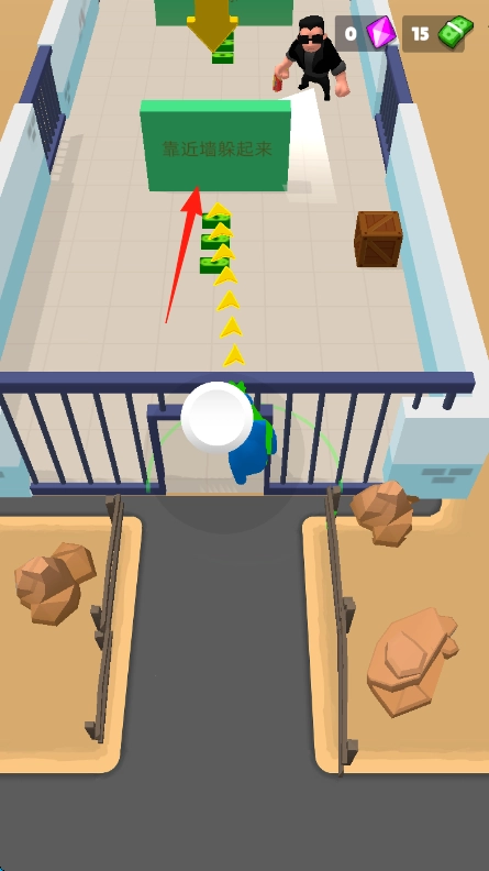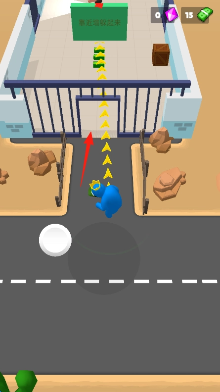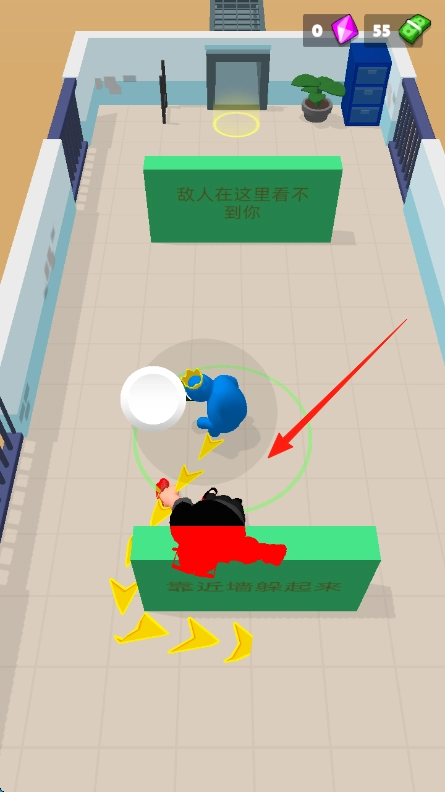 进入游戏后,在界面上操控蓝色角色,按照黄色箭头的指示,朝着绿色标识所标注的、靠近墙壁可隐蔽的位置移动。