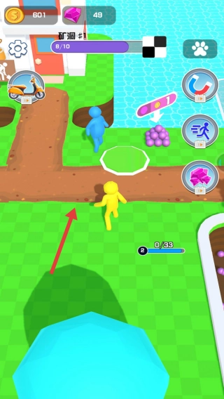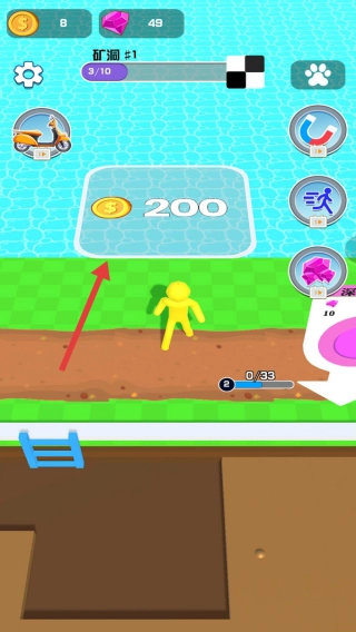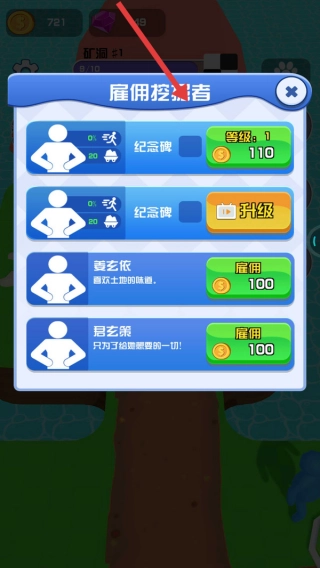 1、玩法机制操控黄色小人,在矿区挖掘、收集金币,通过雇佣挖掘者(纪念碑、春艺依等),升级矿工,提升挖掘效率,推进矿洞进度(8/10→3/10)。