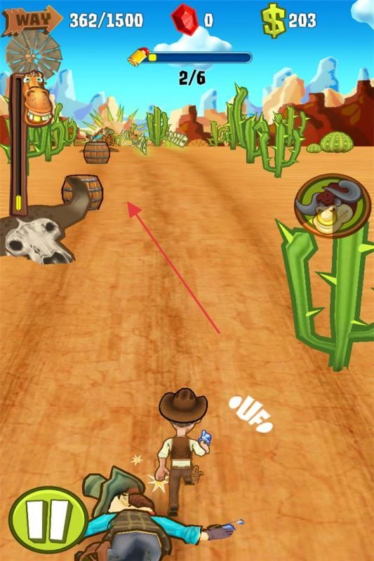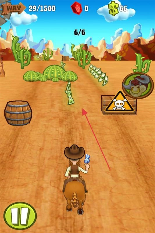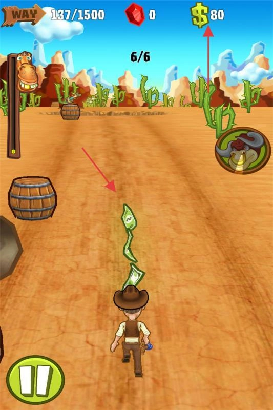 1、操控牛仔沿西部路径奔跑,左右滑动躲避障碍,收集金钱、道具。