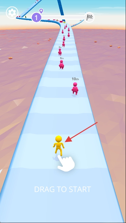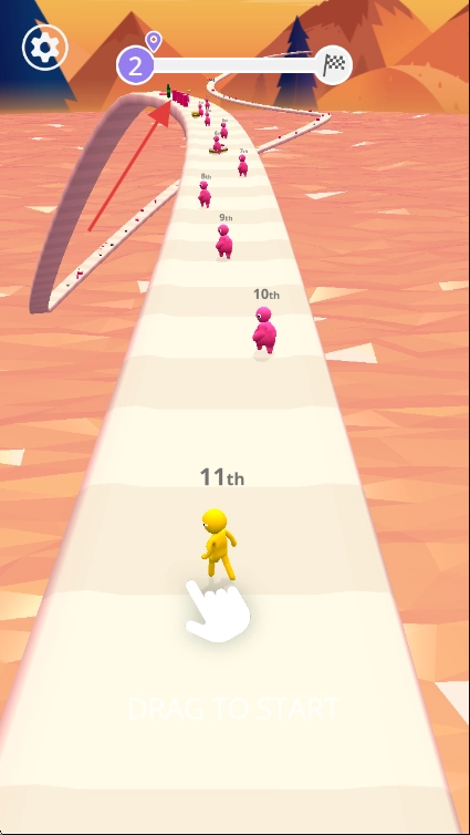 1、进入游戏,拖动黄色小人,开启赛道奔跑,初始在队伍后方,需操控超越前方粉色小人。