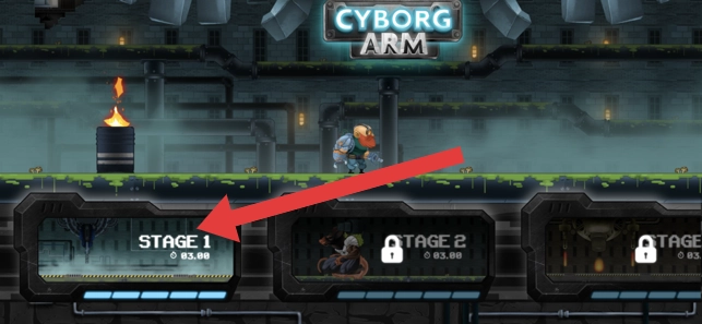 1、在关卡选择界面,点击【STAGE1】,进入第一关,操控改造人角色,开启机械臂战斗冒险。