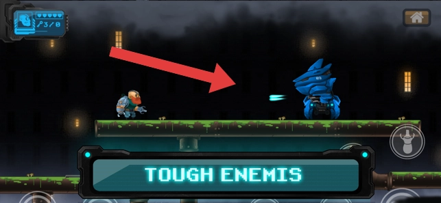 3、面对“TOUGH-ENEMY”(强大敌人),利用机械臂技能,瞄准攻击蓝色机甲敌人,推进关卡进度。