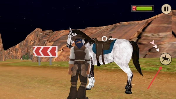 2、在野外靠近马匹,点“Mount”图标上马,掌握骑马基本操作,准备沿路线探索。