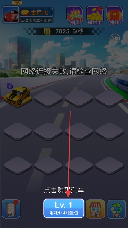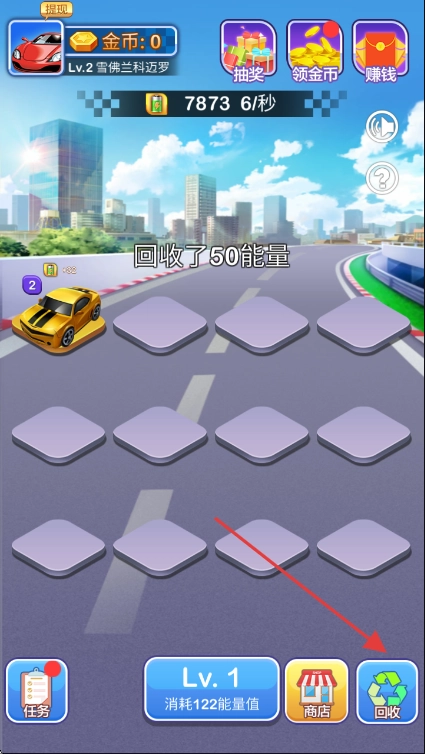 3、当能量值不足时,点击右下角【回收】按钮,回收能量,补充能量以继续购买或升级汽车,推进游戏进程。