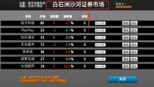 3、在商业区可查看实时变动的证券市场行情,分析走势进行虚拟投资操作影响角色资产状况。