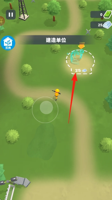 3、当资源满足建造所需的数量(例如右上角显示的【25】)时,移动到【建造单位】的标识位置,点击该标识即可推进单位建造的进程。