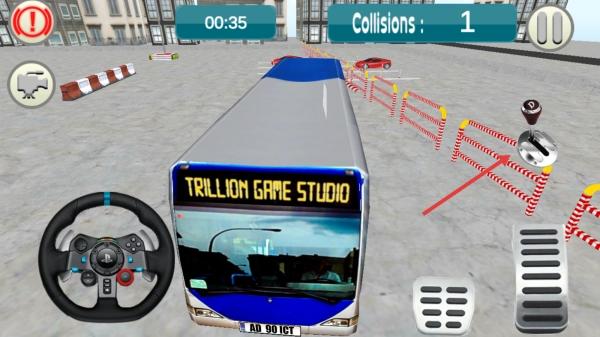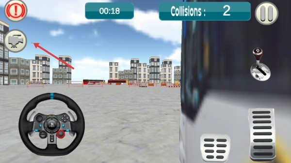 1、点击【START】进入游戏后,你将操控一辆蓝色巴士,通过虚拟方向盘、换挡杆和踏板来控制车辆,在场地内行驶时要避开其他车辆与障碍物,以此熟悉各项操作。