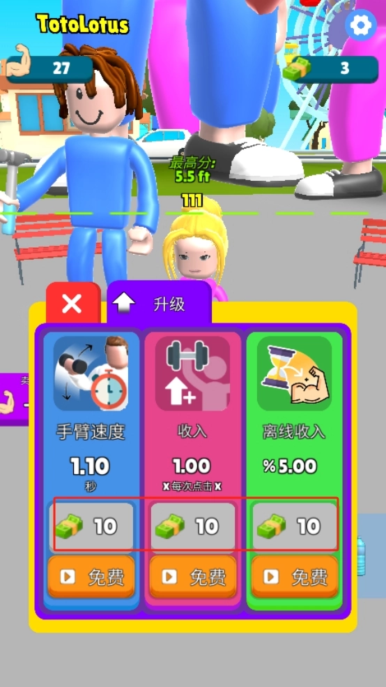 3、进入升级界面后,可通过消耗10金钱,或是观看广告免费提升手臂速度、单次收入、离线收益等属性,以此强化角色能力,助力游戏进程推进。