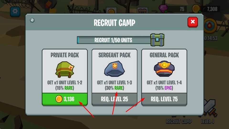 3、进入招募营地,消耗金币或达到等级要求,解锁PRIVATEPACK等兵种包,获取不同品质单位,扩充部队。