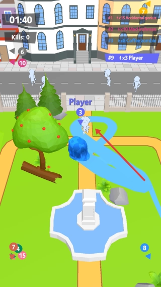 等级提升后,沿着既定路径进行拓展,通过吞噬树木、道具来扩大自身体积;遇到等级低于自己的对手时,可以发起攻击并将其吞噬(相关数量可查看“Kills”计数)。在此过程中,还要留意排行榜信息,注意避让排名靠前的强大对手。