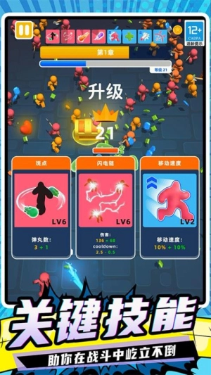 1、深度成长树系统,涵盖超50种可解锁能力选项,既包含范围拓展、伤害增强这类基础属性加成,也有闪电链、毒雾等特色技能,允许玩家自由组合打造专属build。