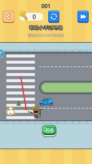 1、启动关卡:点击主界面的“开始游戏”按钮,即可进入“帮助小羊过马路”的第001关。
