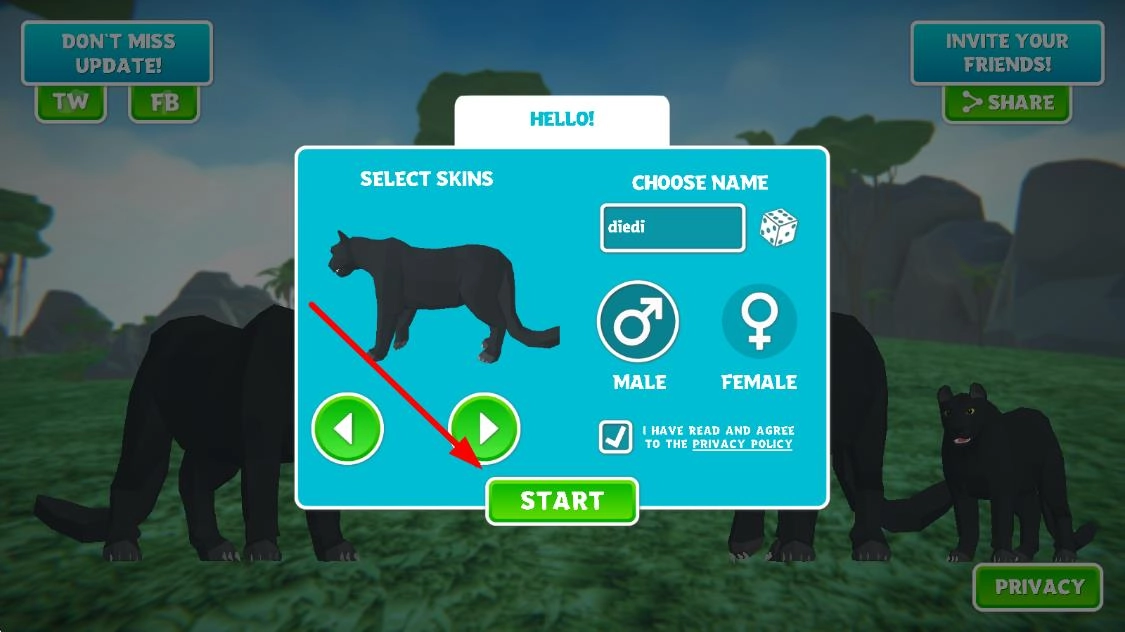 1、进入游戏后操控黑豹在3D森林场景中奔跑捕猎,通过获取食物维持生存,应对野外危机。