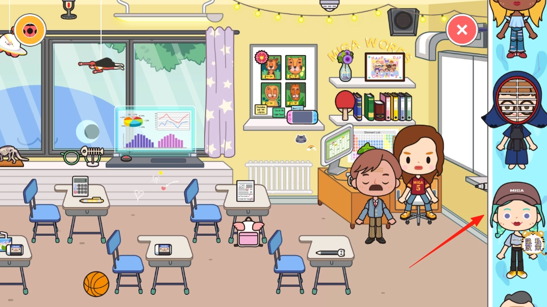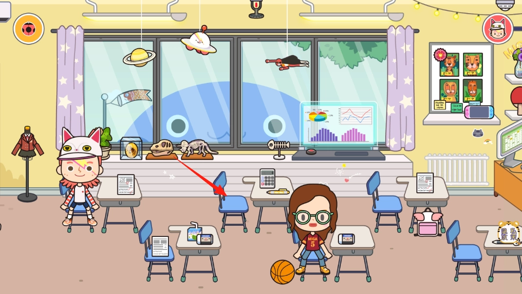 在教室场景里,点击空着的座位,就能让角色坐到上面,和旁边的同学进行互动。
