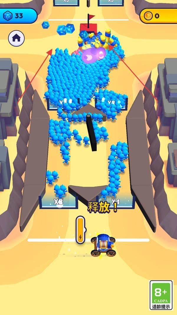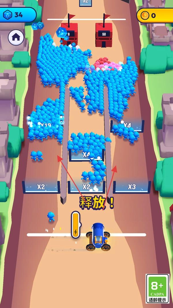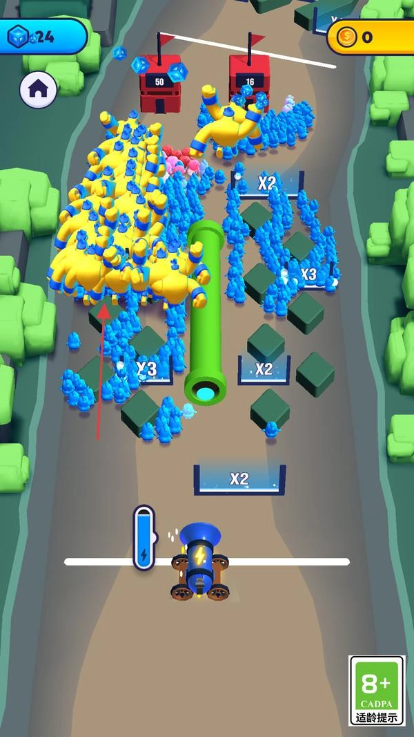 2、点击对应的倍数区域,释放蓝色等单位,凭借数量上的优势突破路径中的障碍,朝着敌方建筑推进。