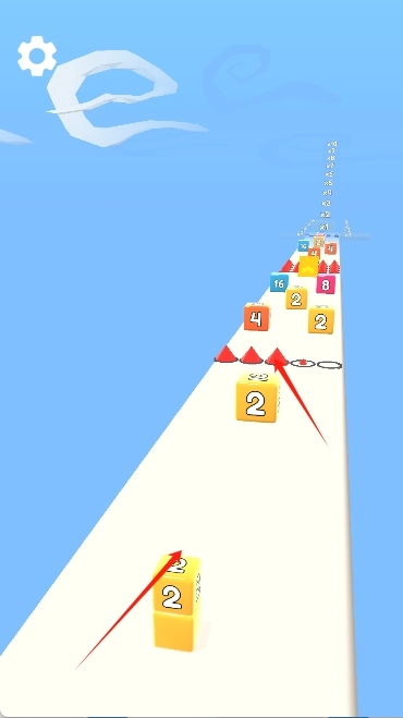 1、操控着数字2的方块踏上简洁赛道,开始收集首个同数字方块,准备迈出合成第一步。