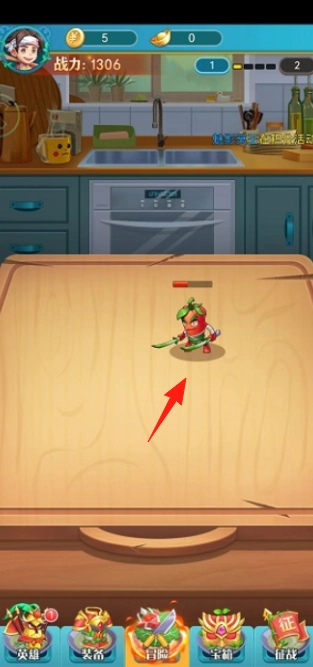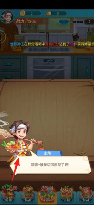 1、点击红箭头所指的主角,查看当前战力数值(1306),随后进入厨房场景,领取“切回原型”的提示,同时解锁界面下方的英雄装备功能。
