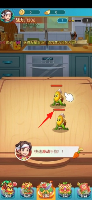 2、在案板(红箭头所指位置),快速滑动手指来合成玉米食材,通过触发互动提升食材等级,同时积累资源(可获得5枚金币),为后续的冒险环节做好准备。