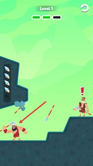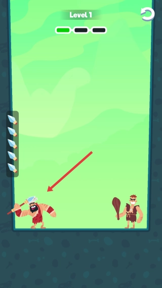 1、触发机关:借助左侧的装置发射斧、石、矛等武器,攻击下方那个手持斧头的角色。