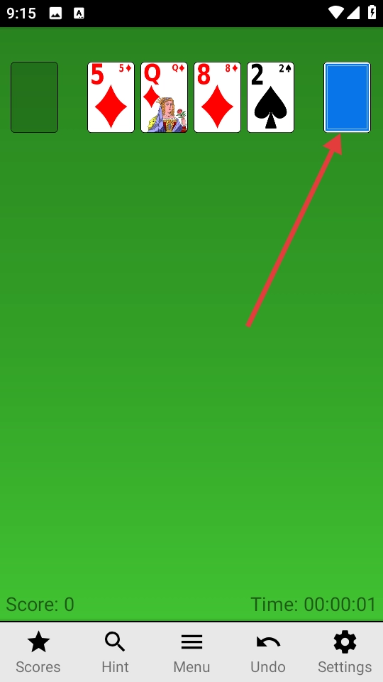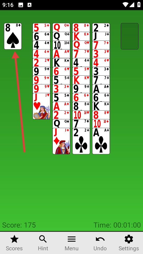 2、点击牌堆补充新牌,将四组花色整理至右上角即算胜利。