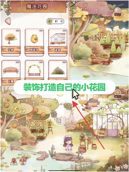 2、前往魔法花园,挑选树木、温室等装饰元素,对区域进行布置,打造出专属于自己的小花园。