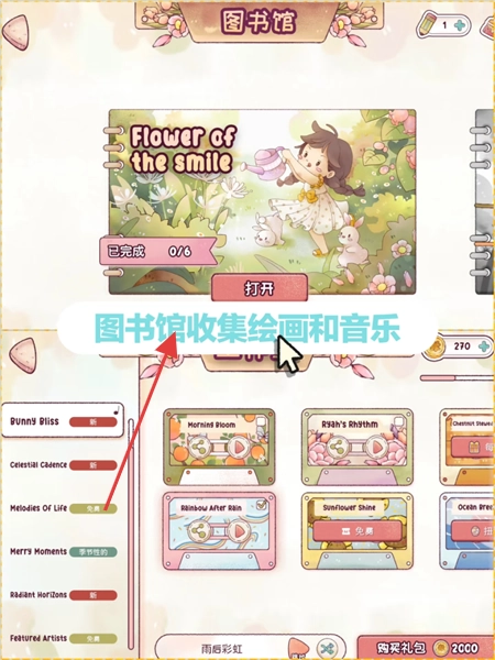 3、进入图书馆界面,收集绘画作品,解锁音乐,感受艺术收集的乐趣。