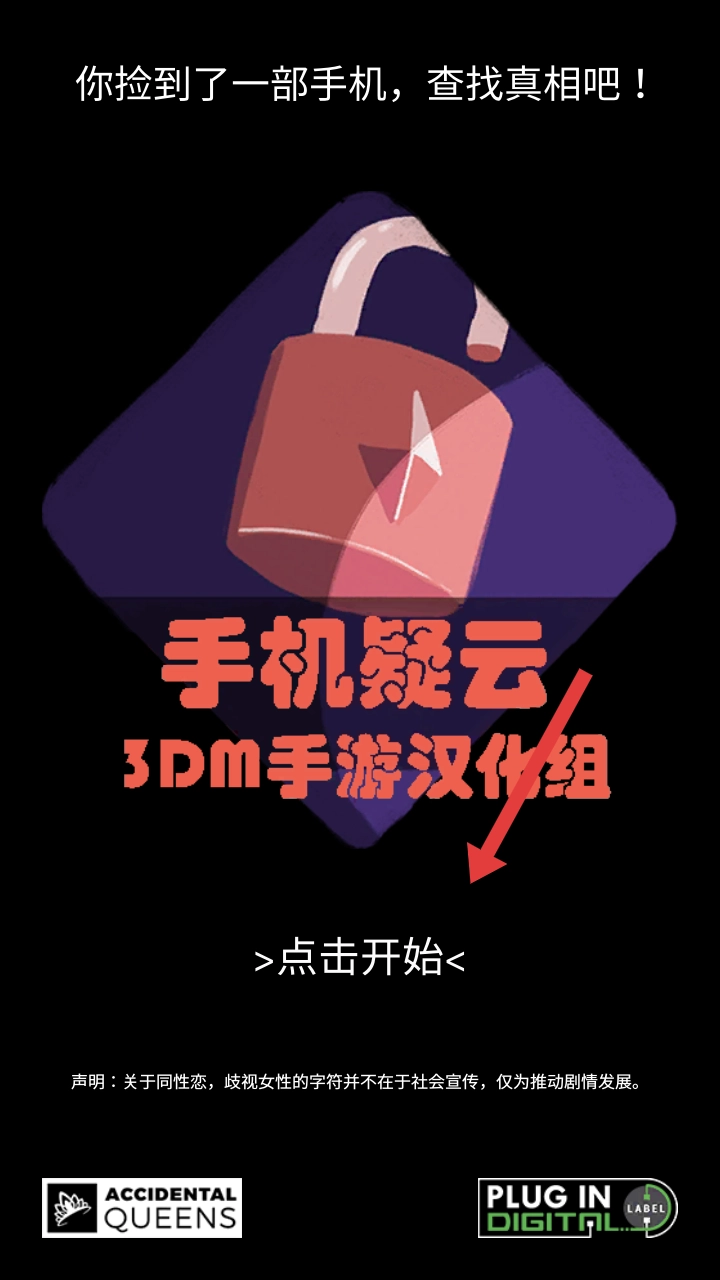 1、打开手机疑云的启动界面,找到箭头所指的【点击开始】按钮并点击,由此开启“捡手机查真相”的解谜旅程。