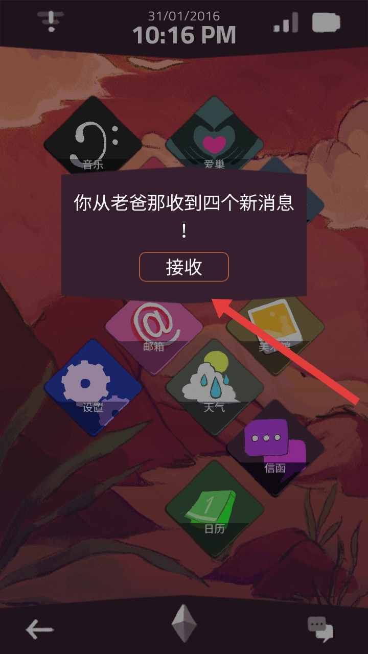 2、加载到手机主界面后,会弹出“你从老爸那儿收到四条新消息”的提示框,点击带有箭头标注的【接收】按钮,就能解锁老爸发来的未读消息。