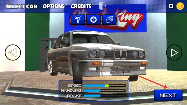 1、选银色轿车(看Speed/Handling/Brake属性),点【NEXT】,进入场景选择。