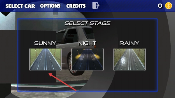 2、选【SUNNY】晴天场景,适应公路赛道环境。