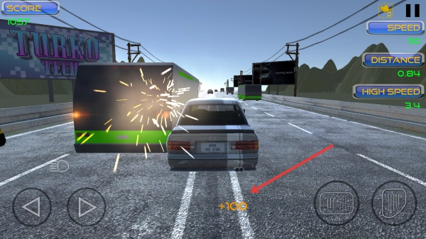 3、驾驶时避货车,撞车减分,吃“+100”道具加分,看右侧Speed/Distance等数据,保持高速冲线。