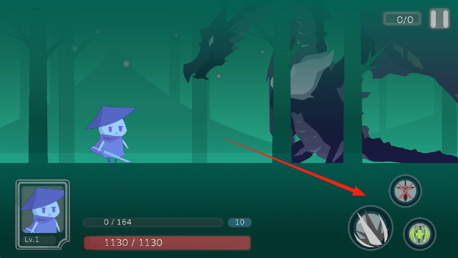 1、操控角色在森林里移动,遇到巨龙之类的怪物时,点击技能进行战斗,并尝试脱离战斗状态。