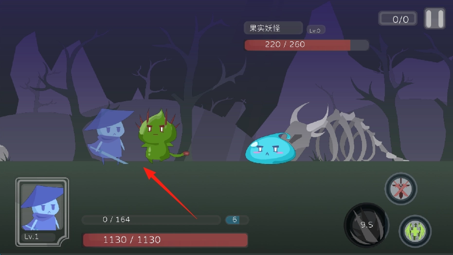2、踏入新场景后,会遇到果实妖怪这类敌人,此时需挑选合适技能发起攻击,同时要留意自身的血量情况。