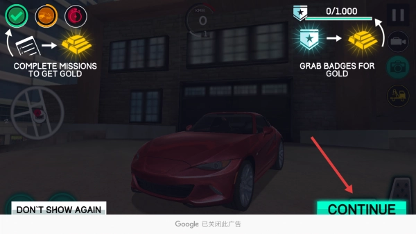 2、在车库页面点击【CONTINUE】按钮,驾驶红色跑车,启动任务。